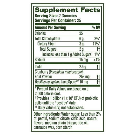 Inulin (as chicory root fiber) 2, 5 g , Cranberry (Vaccinium Macrocarpon) Fruit Powder 258 mg , Bacillus Coagulans LactoSpore 10 mg OTHER INGREDIENTS: Water, Sucrose, Pectin; Less than 2% of: Sodium Citrate, Citric Acid, Natural Flavors, Coconut Oil, Carnauba Wax, Corn Starch Provides an effective level of bacteria (1 x 109 CFU) until at least the best by date, Daily Value (DV) not established