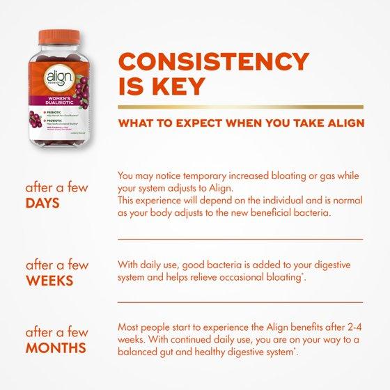 - GREAT-TASTING AND CONVENIENT: Align Women's Prebiotic + Probiotic Gummies taste great, are easy to chew and don't require water to take. They're the good-for-you supplement that you'll actually look forward to taking!