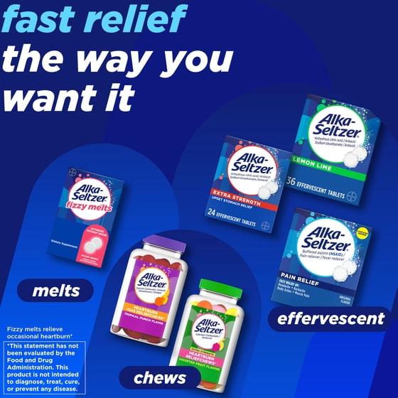 When pain hits, don’t let it interrupt your day. Alka-Seltzer’s fast pain relief has your back! These aspirin effervescent tablets dissolve quickly in water, getting to work fast on pain symptoms like headache, body pain, backache, and muscle pain. These pain relief effervescent tablets are easy to take on the go, just drop, fizz, and drink to relieve body pain, headaches, backaches, and muscle pain whenever and wherever you need it. From a brand trusted for over 90 years, Alka-Seltzer knows how to relieve pain fast. Use as directed.