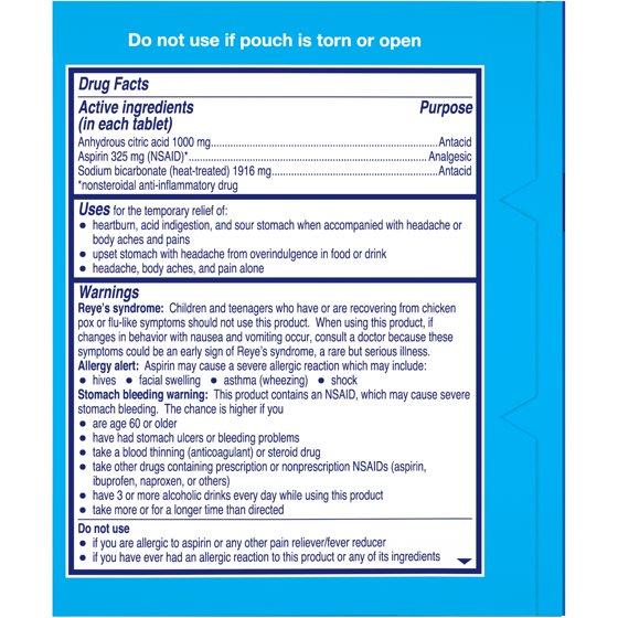 Anhydrous citric acid 1000 mg (Antacid), Aspirin 325 mg (NSAID)* (Analgesic), Sodium bicarbonate (heat-treated) 1916 mg (Antacid), *nonsteroidal anti-inflammatory drug