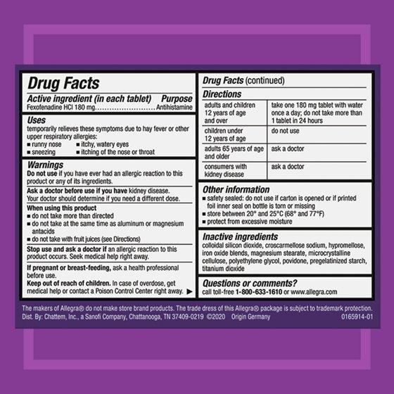 For your allergy symptoms, nothing works faster* than Allegra Adult 24-Hour Allergy Relief Tablets. Allegra allergy relief medicine starts working in one hour for relief from sneezing, runny nose, itchy and watery eyes, and itchy nose or throat. One pill provides 24-hour allergy relief that doesn’t make you drowsy and affect your normal brain function. Each tablet is formulated with active ingredient fexofenadine HCI for powerful relief from indoor and outdoor allergens like pollen, ragweed, grass, trees, dust, mold, and pet dander. Stock up on Allegra 24-Hour Tablets for fast*, effective allergy relief. That’s a no-brainer. *Starts working in one hour; applies to first dose only. Among single-ingredient non-drowsy OTC branded oral antihistamines