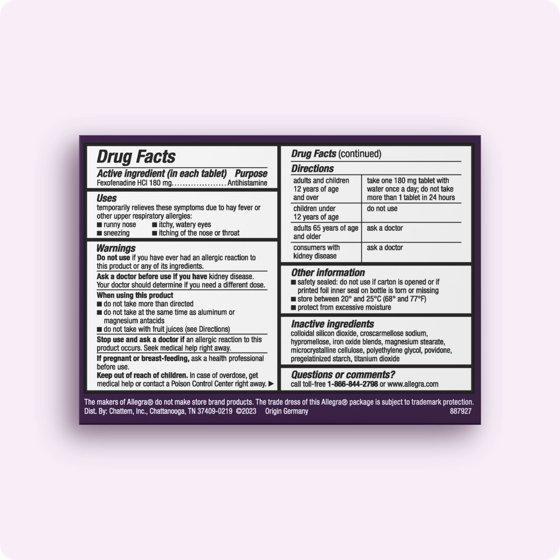 For your allergy symptoms, nothing works faster* than Allegra Adult 24-Hour Allergy Relief Tablets. Allegra allergy relief medicine starts working in one hour for relief from sneezing, runny nose, itchy and watery eyes, and itchy nose or throat. One pill provides 24-hour allergy relief that doesn’t make you drowsy and affect your normal brain function. Each tablet is formulated with active ingredient fexofenadine HCI for powerful relief from indoor and outdoor allergens like pollen, ragweed, grass, trees, dust, mold, and pet dander. Stock up on Allegra 24-Hour Tablets for fast*, effective allergy relief. That’s a no-brainer. *Starts working in one hour; applies to first dose only. Among single-ingredient non-drowsy OTC branded oral antihistamines