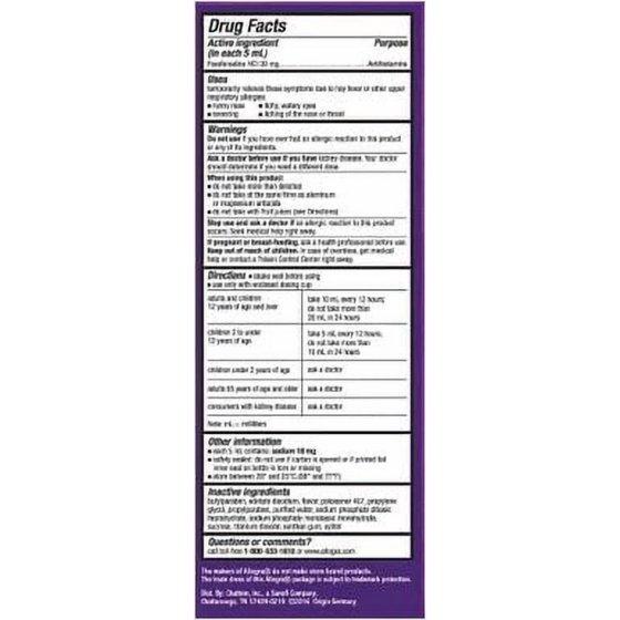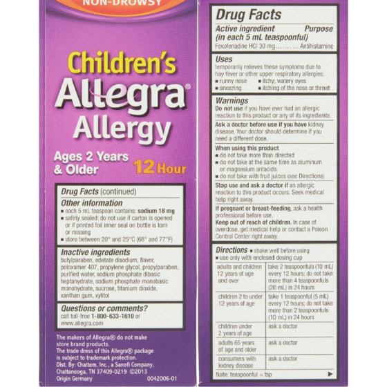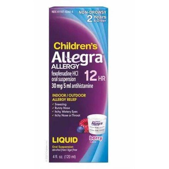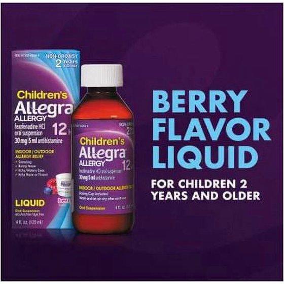 Kid allergies are unpleasant. Taking their allergy medicine doesn't have to be. Alleviate their worst allergy symptoms with Allegra Children's Non-Drowsy Antihistamine Liquid Berry Flavor. Children's Allegra for kids 2 years and older provides 12 full hours of non-drowsy relief from sneezing, runny nose, itchy and watery eyes, and itchy nose or throat. Use Allegra Children's Liquid for indoor and outdoor allergies, including seasonal allergies and pet allergies. Best of all, this berry-flavored allergy medicine is made with active ingredient fexofenadine, a non-drowsy antihistamine. Be ready for spring allergies, fall allergies, dog allergies and more. Stock up on Children's Allegra 12-Hour Berry Flavor Liquid Allergy Medicine. DIRECTIONS: Adults and children 12 years of age and over: Take 10 mL every 12 hours; do not take more than 20 mL in 24 hours. Children 2 to under 12 years of age: Take 5 mL every 12 hours; do not take more than 10 mL in 24 hours. Children under 2 years of age: Ask a doctor. Adults 65 years of age and older: Ask a doctor. Consumers with kidney disease: Ask a doctor.