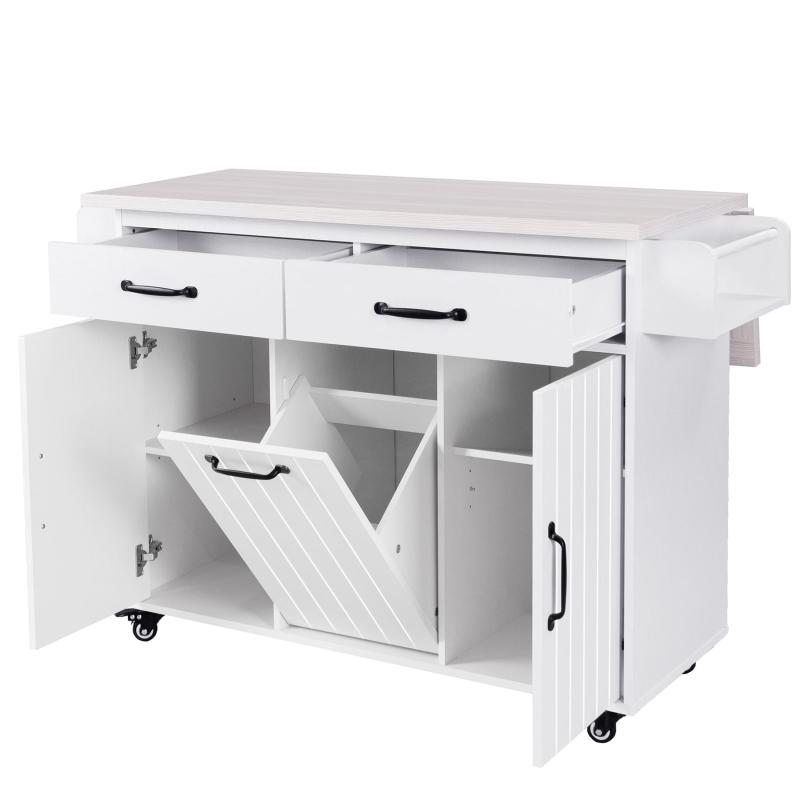 This Alvantor 51'' W large rolling kitchen island adds a charming modern touch to any kitchen or dining space. Made from durable Grade MDF, particleboard, and solid wood, it features a stylish countertop with a drop leaf for extra workspace. The foldable design and locking wheels make it incredibly versatile and easy to move. With two large drawers, two cabinets, and removable shelves, it offers ample storage options. The overall dimensions are 51.06" x 20.55" x 35.04", providing plenty of space for all your kitchen essentials. The side towel and spice racks keep items within easy reach, while the hidden trash bin is perfect for kitchen waste or pet food storage. The drop-leaf countertop expands from 19.7” to 31.7”, offering extra space when needed. Ideal for kitchens, dining rooms, or small apartments, this rolling kitchen island blends functionality and style.
