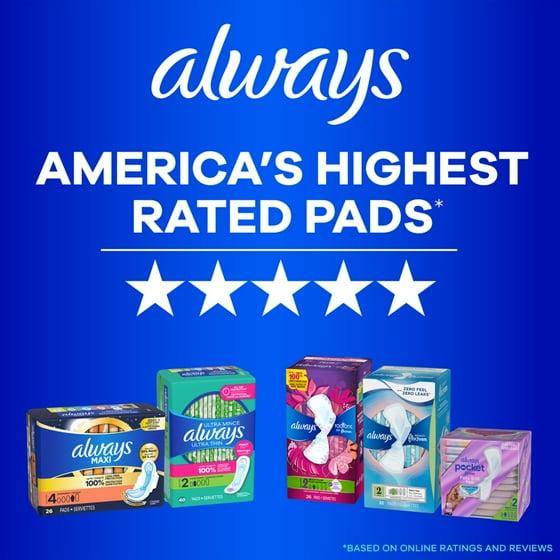 Always Maxi Overnight Pads provide you a PERFECT NIGHT SLEEP with 45% larger back vs Always Regular Maxi Pad for better coverage during the night. If you're looking for uncompromised period protection, you've come to the right place. Always Maxi Pads ABSORB 50% MORE vs. same size Always Ultra Thin Pad. Additionally, Always Maxi Pads also feature the Always 3X Protection System to give you up to 100% leak-free comfort, no matter how you sleep. Always Maxi Pads possess RapidDRY Technology, which works to wick away gushes fast to absorb more than you may need. Experience long lasting protection with leakGUARD technology that locks in leaks, and SecurelyFITS helps the pad stay in place throughout no matter what you do. Make sure that you are getting the right protection from your pad, as using the wrong pad size can lead to leaks. Whether you have a heavy flow or a light one, Always has you covered. Always Maxi Pads come in a range of sizes fit your flow and size perfectly depending on your needs. If you have a light flow or need a teen-sized pad, then we would recommend using our Always Maxi Pad size 1 to 3. If you have a heavy flow or want overnight protection, then we recommend using our size 4 or 5 Always Maxi Pad. We've got your flow covered day and night for up to 100% leak-free protection.