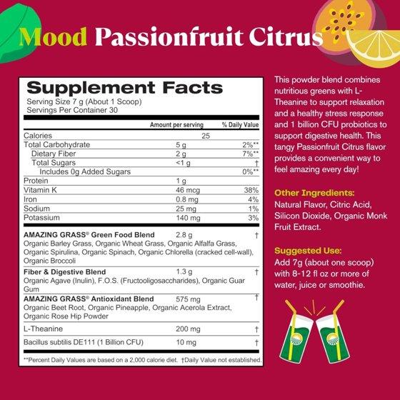 Feel amazing every day with Amazing Grass Mood Passionfruit Citrus Greens Powder Blend! This convenient superfood powder combines a purposeful combination of 10 fruits, veggies, and greens to support your overall health and wellness. With 200mg L-Theanine, it’s designed to support relaxation, promote a healthy stress response, and help soothe your mind — all without drowsiness. Your gut will thank you too: each scoop delivers 1 billion CFU probiotics (DE111) to support digestive and gut health, keeping you feeling light and balanced. Plus, you’ll get an excellent source of Vitamin K and the nutrition of thoughtfully grown greens harvested for peak nutrition from U.S. family farms. We keep it clean — this blend is Certified Organic by CCOF, sugar free, gluten free, plant-based, kosher, vegan, and made with non-GMO ingredients. Sweetened with monk fruit, it’s a simple, delicious way to support vitality and get the greens your body craves. Whether you’re fueling a busy morning or need a healthy afternoon boost, just mix one scoop (7g) into 8-12 fl oz of water, juice, or your favorite smoothie. The tangy Passionfruit Citrus flavor makes it a treat to unwind and relax — helping you feel your best every day.