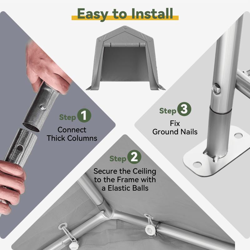 - Stable Windproof Structure: The car car storage shed Constructes with 1.5" thick powder-coated steel pipes and spray-molded joints, along with multiple roof fasteners, ensuring stability and resistance to chipping and corrosion in harsh weather.