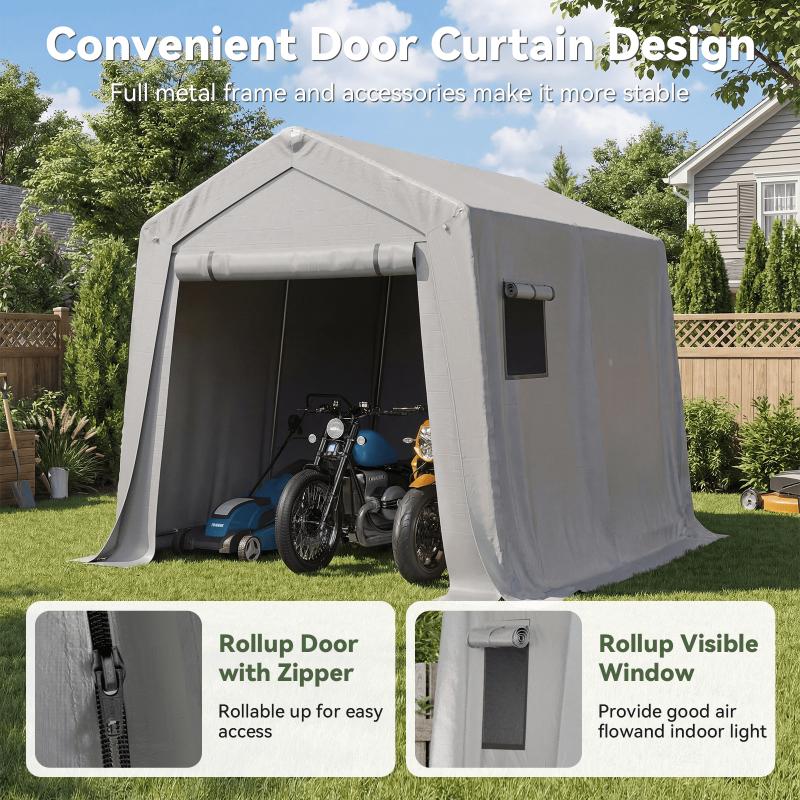 - Spacious Ventilated Design: This 10x10FT motorcycle storage shed includes roll-up zipper doors for easy access and optimal airflow, suitable for motorcycle storage, bikes, tools, or patio furniture.