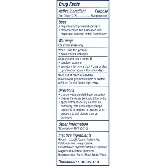 Active Ingredient: Zinc Oxide 40.0%...Purpose: Skin Protectant Ointment. Inactive Ingredients: Glycerin, Caprylic/Capric Triglyceride, Octyldodecanol, Polyglyceryl-4 Diisostearate/Polyhydroxystearate/Sebacate, Magnesium Stearate, Panthenol, Butyrospermum Parkii (Shea) Butter, Water.