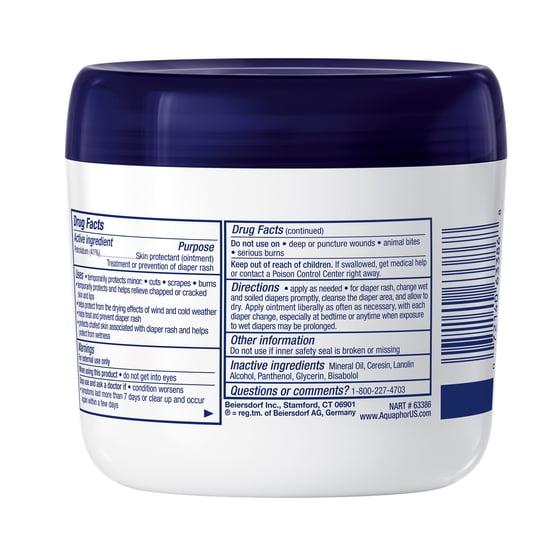 Aquaphor Baby Healing Ointment is suitable for baby's sensitive skin. This is the number 1 pediatrician recommended multi-purpose solution for your baby's many skincare needs. Ideal for relieving diaper rash, this healing baby ointment is also great for soothing dry, chapped or cracked skin and helps prevent chafing. It nourishes and protects baby's skin to enhance healing from skin irritations such as chapped skin from teething and drool rash. Uniquely formulated with 41% Petrolatum to allow oxygen to flow. Moms can also use the ointment to soften dry hands and cuticles, cracked heels or chapped lips. To use: Apply Ointment with every diaper change to protect the skin from wetness, acidity and chafing. Also use for diaper rash, drool rash, minor scrapes and scratches, as well as dry chafed skin. If the diaper area does get irritated, use soothing Aquaphor Baby Diaper Rash Cream for mild to moderate diaper rash and fast relief Aquaphor Baby Diaper Rash Paste for more troublesome rashes. Aquaphor Baby Ointment is a white translucent to light yellow ointment. Color variations occur due to the nature of the ingredients in the product, but do not affect product safety and performance.