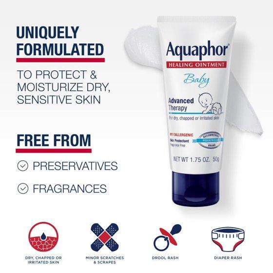 Aquaphor Baby Healing Ointment: minor cuts, scratches & scrapes, burns, & dry, chapped skin. For diaper rash, apply Aquaphor Baby Healing Ointment liberally as often as necessary, with each diaper change, especially at bedtime or anytime when exposure to wet diapers may be prolonged. After cleaning the diaper area allow skin to dry completely before applying. For moderate diaper rash, also try Aquaphor Baby Diaper Rash Cream. Aquaphor Baby 3-in-1 Diaper Rash Cream: Change wet and soiled diapers promptly, Cleanse the diaper area, and allow to dry. Apply cream liberally as often as necessary, with each diaper change, especially at bedtime or anytime when exposure to wet diapers may be prolonged. Aquaphor Baby Diaper Rash Paste: Change wet and soiled diapers promptly. Cleanse the diaper area and allow to dry. Apply cream liberally as often as necessary, with each diaper change, especially at bedtime or anytime when exposure to wet diapers may be prolonged.