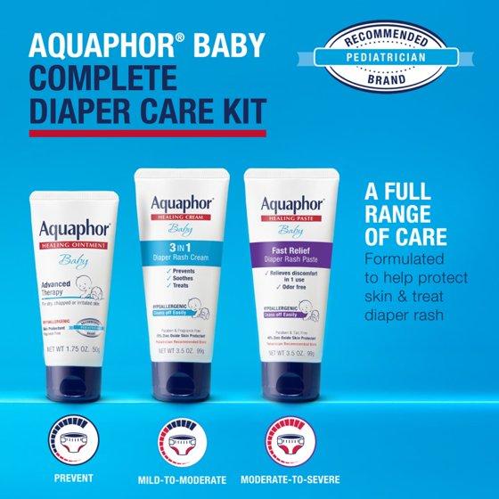 - One 1.75 oz Aquaphor Healing Ointment, one 3.5 oz Diaper Rash Cream and one 3.5 oz Diaper Rash Paste, diaper essentials