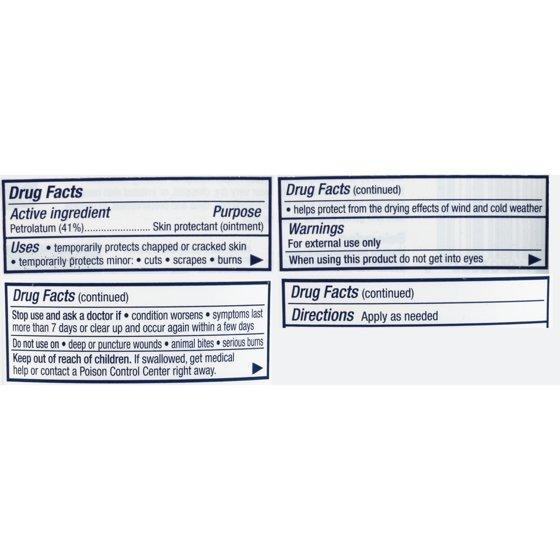 Active Ingredients: Petrolatum (41 %), Skin Protectant (Ointment). Inactive Ingredients: Mineral Oil, Ceresin, Lanolin Alcohol, Panthenol, Glycerin, Bisabolol.