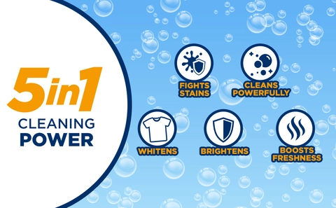 • HE detergent delivers 5 powerful cleaning benefits in 1: attacks stains, fights odors, whitens whites, brightens colors and delivers a freshness boost