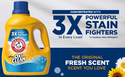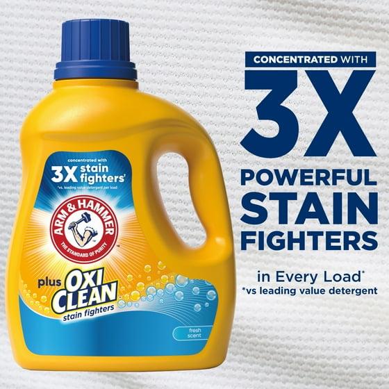ARM & HAMMER Plus OxiClean Liquid Laundry Detergent is ideal in standard and High Efficiency (HE) washing machines. This low-sudsing, clean-rinsing fresh scent detergent delivers 5 powerful cleaning benefits in 1: it attacks stains, fights odors, whitens whites, brightens colors and delivers a boost of freshness. This laundry detergent powers out microscopic stains and dirt to deliver a hygienic clean. Concentrated with 3X powerful stain fighters in every load versus the leading value detergent, this HE detergent is powerful enough to handle your toughest loads in all wash temperatures, even cold water. Supercharged with OxiClean stain fighters to attack over 101 tough stains This HE laundry detergent keeps whites whiter and brights brighter (vs regular ARM & HAMMER). Blended with trusted ARM & HAMMER Baking Soda, this laundry soap is tough on odors, dirt and stains, leaving clothes clean and fresh.
