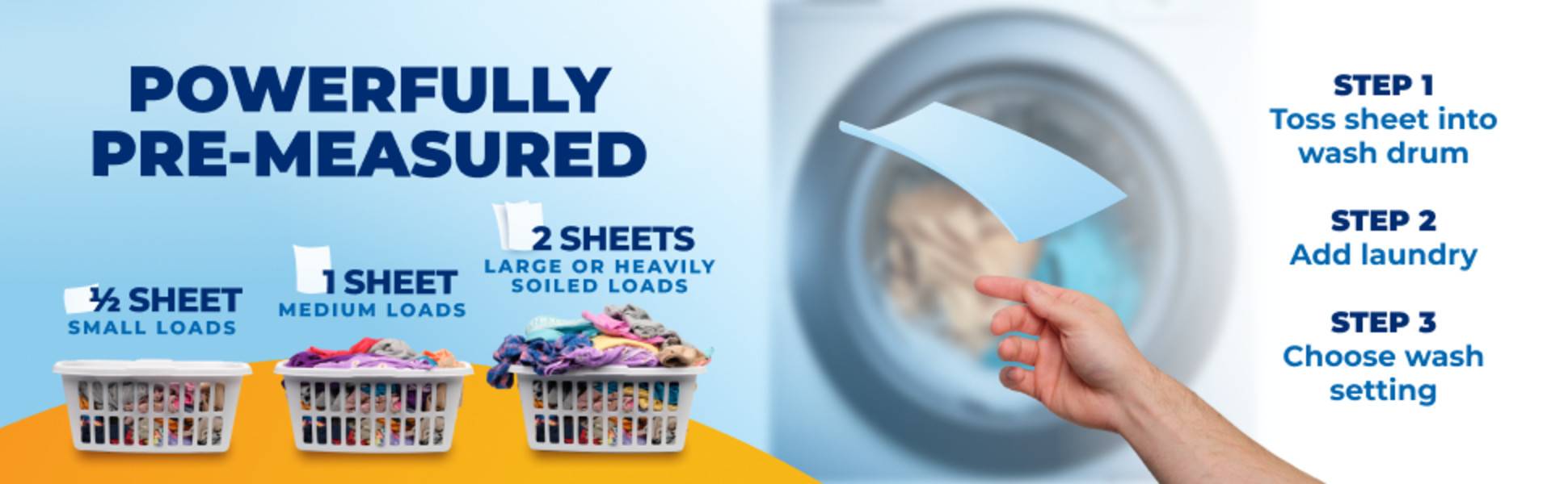 - Toss a detergent sheet into the wash drum and add laundry; use 1 sheet for medium loads and 2 sheets for large/heavily soiled loads for flexible dosing