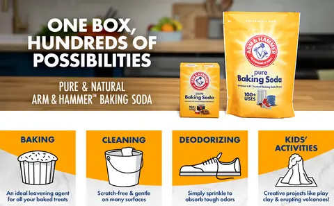 - ARM & HAMMER Pure Baking Soda is free of harsh chemicals and gentle enough to use on many surfaces; you can feel good about using it as an effective deodorizer, kitchen cleaner, bathroom cleaner, laundry cleaner, and odor eliminator