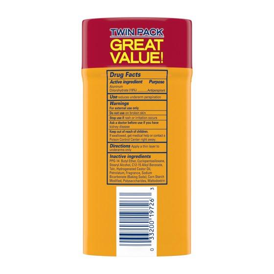 - TWIN PACK: Two solid stick antiperspirant deodorants, 2.6 oz each