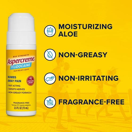 - Contains one (1) 2.5-oz. roll-on bottle of Aspercreme Lidocaine Pain Relief Liquid With No-Mess Roll-On Applicator