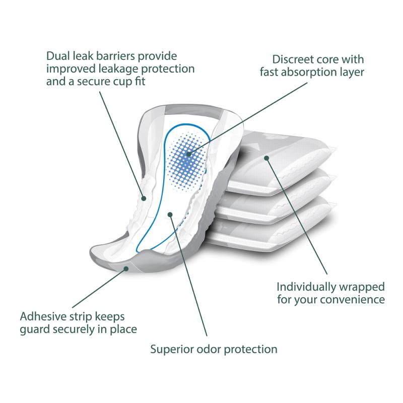 Assurance Men’s Guards with Maximum Absorbency, 52 Count offer a discreet fit for and dependable protection. Each guard features a breathable top and bottom layer and advanced liquid-locking technology to help keep skin dry and comfortable throughout the day. These one-size-fits-all guards are ideal for light to moderate bladder leakage and fit easily into regular underwear for added convenience. Assurance Men’s Guards, Maximum Absorbency, 52 Count provide reliable coverage with comfort and discretion.