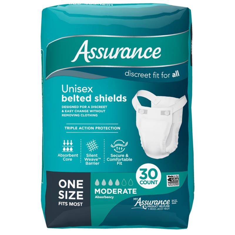 Assurance Incontinence Unisex Belted Shields offers protection and confidence during the day or night with moderate absorbency. The moderate absorbency quickly lock away wetness and help control odors. Strong, plush and flexible elastic belts provide a snug and secure fit and are held in place with no-tear buttonholes. A soft Silent Weave moisture barrier with a cloth-like feel keeps clothing and bedding dry for added discretion. These soft, strong elastic belts are extra wide, with more plush materials next to your body so they stay comfortable. This one size fits all incontinence supplies come in a 30-count pack. Stay protected and comfortable with the Assurance Incontinence Unisex Belted Shields.