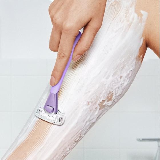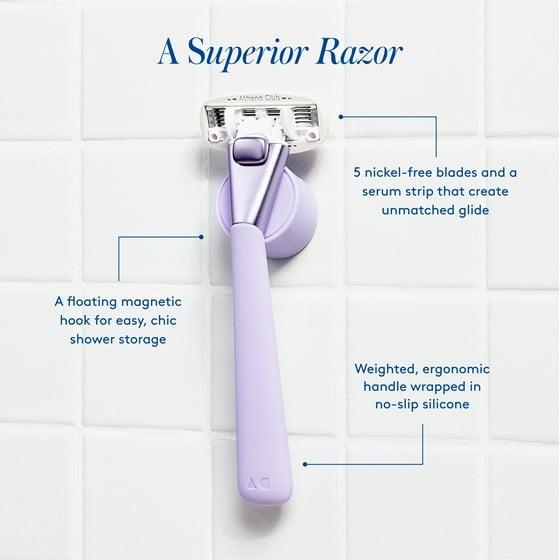 Shaving is a treat, not a chore with Athena Club’s curve-loving women’s razor. Five spaced-out blades surrounded by moisturizing shea butter and hyaluronic serum glide over curves to help prevent bumps, razor burn, and irritation. Get excited for your closest, smoothest shave yet! Each razor kit for women includes a non-slip ergonomic handle, a magnetic shower hook, and 2 razor blade cartridges. Razor Kit available in 5 color options designed to complement your bathroom: Super Pink and Lilac.