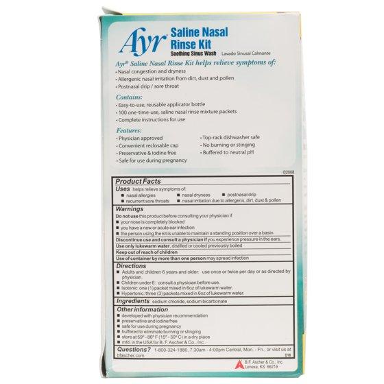 Product Facts,Helps relieve symptoms of: nasal allergies, recurrent sore throats, nasal dryness, nasal irritation due to allergens, dirt, dust & pollen, and postnasal drip,Do not use the product before consulting your physician if your nose is completely blocked, you have a new or acute ear infection, and/or the person using the kit is unable to maintain a standing position over a basin.,Discontinue use and consult a physician if you experience pressure in the ears. Use only lukewarm