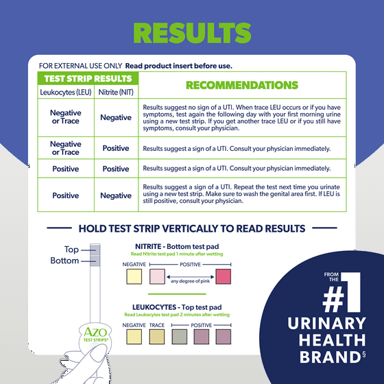 Is it really a UTI? Trust the same type of UTI tests that many doctors use! Treating a urinary tract infection early is the key to fast UTI relief and preventing more serious problems. With AZO Test Strips, you can take a UTI test at home safely and simply, then call your doctor with the results. The same type of UTI tests that most doctors use to diagnose a UTI. Two tests in one – including both Leukocyte (white blood cells) and Nitrite tests – both tests commonly used to diagnose a UTI. Accurate test results. Test results are ready to read in just two minutes. Clean grip handle is sanitary and easy-to-use! (Strips, Urine)