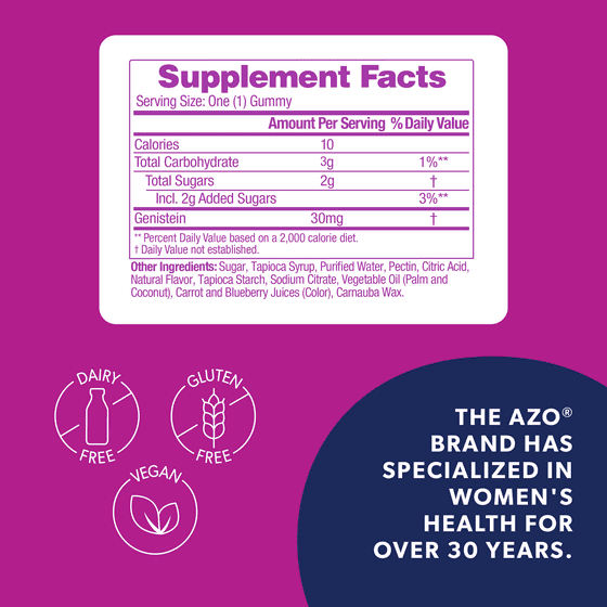 Take on menopause with a tasty, vegan gummy! AZO® Menopause Relief Daytime Gummies help manage the frequency and intensity of hot flashes and night sweats, so you can feel more comfortable throughout your day. Formulated with clinically studied genistein, these delicious blackcurrant-flavored gummies provide hormone-free support for menopause symptoms—no pills required. (Women's Health, 30 Count of Dietary Supplements)