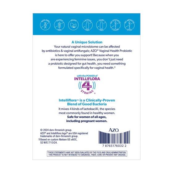 - AZO COMPLETE FEMININE BALANCE TO THE RESCUE!: It works differently because it contains INTELLIFLORA the only clinically proven probiotic blend with the 4 species of beneficial bacteria most commonly found in healthy women