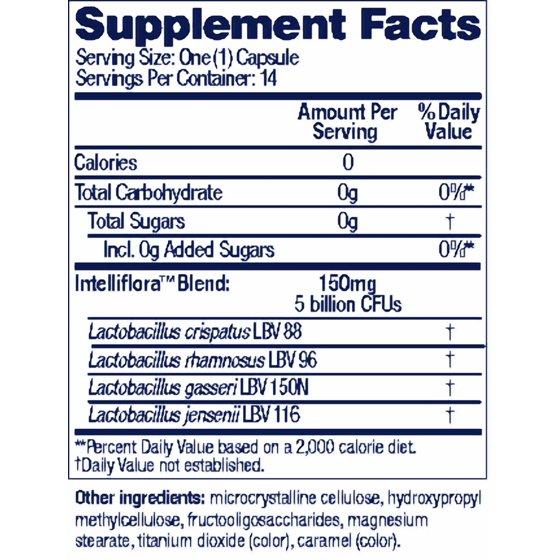 Ntelliflora™ Blend, Lactobacillus crispatus LBV 88, Lactobacillus rhamnosus LBV 96, Lactobacillus gasseri LBV 150N, Lactobacillus Jensenii LBV 116, Microcrystalline Cellulose, Hydroxypropyl Methylcellulose, Fructooligosaccharides, Magnesium Stearate, Titanium Dioxide (color), Caramel (color)