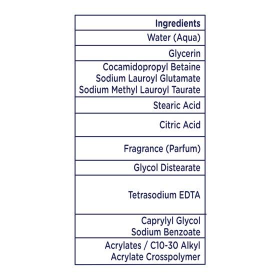 Ingredients: Water (Aqua), Glycerin, Cocamidopropyl Betaine, Sodium Lauroyl Glutamate, Sodium Methyl Lauroyl Taurate, Stearic Acid, Citric Acid, Fragrance (Parfum), Glycol Distearate, Tetrasodium EDTA, Caprylyl Glycol, Sodium Benzoate, Acrylates/C10-30 Alkyl Acrylate Crosspolymer.