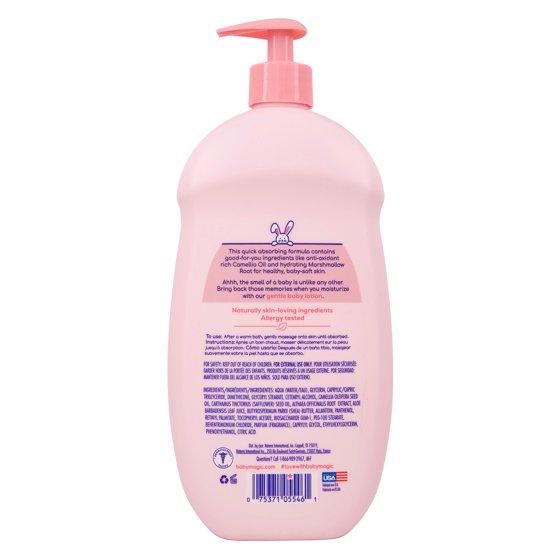 Baby Magic Gentle Baby Lotion with Original Baby Scent, 30 oz ; UPC: 075371055461. Baby Magic Baby Lotion with original baby scent, Camellia oil and marshmallow Root, features gentle and nourishing botanical properties. Contains fatty acids and vitamins.Enriched with anti-oxidant rich Camellia oil and hydrating marshmallow Root. Gently massage onto skin until absorbed. Sulfate free, Dye Free and paraben free, No Phthalates, no formaldehyde donors. This hypoallergenic baby lotion formula is mild enough for baby’s sensitive skin, and enhanced with vitamins A and E to help retain the natural moisture of baby’s delicate skin. Our baby lotion is a one of a kind formula, specially formulated for baby skin conditioning and protection.
