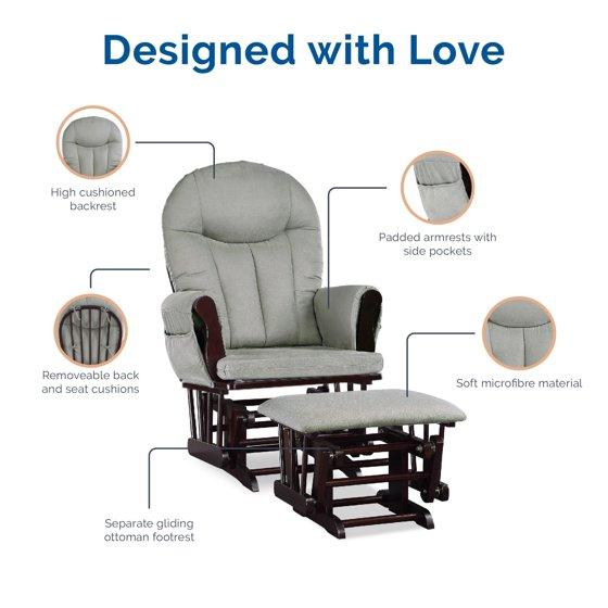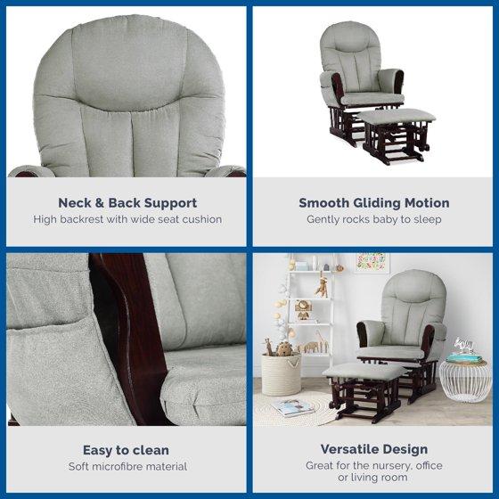 - TOTAL PACKAGE: Our 2-Piece Nursery Glider and Ottoman Set offers parents firm support and is a great investment for any baby room. The traditional rocker presents a solid wooden base and a smooth gliding mechanism for super-quiet rocking chair motion