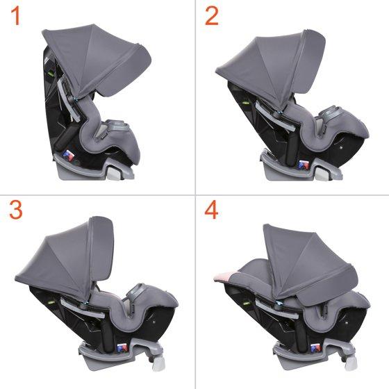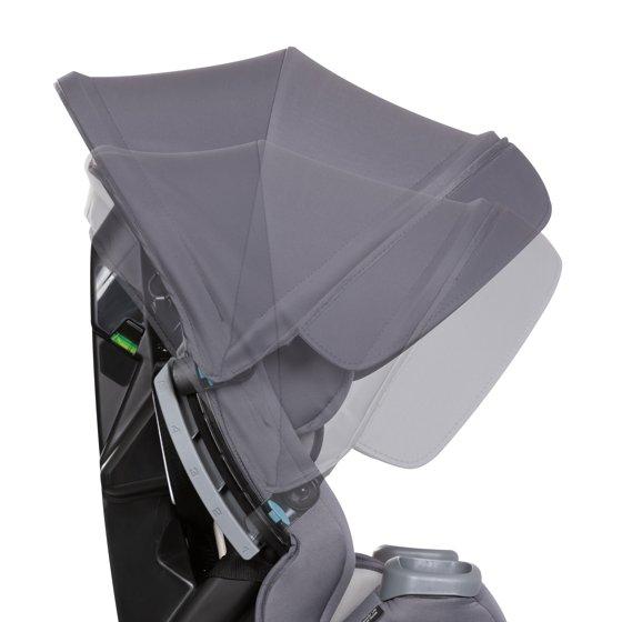 - Integrated Adjustable Canopy for UV Protection: Integrated height and angle adjustable canopy for in-car UV protection. Flip-out side visors provide additional shade protection for either side of the car seat.