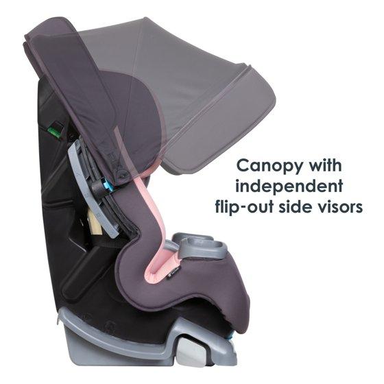 • Integrated Adjustable Canopy for UV Protection: Integrated height and angle adjustable canopy for in-car UV protection. Flip-out side visors provide additional shade protection for either side of the car seat.