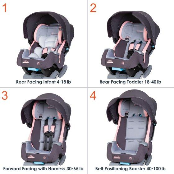 Introducing the Baby Trend Cover Me™ 4-in-1 Convertible Car Seat! In our study involving 400+ moms currently using convertible car seats, the #1 complaint about their convertible is children irritated by sunlight in the cars. The Cover Me™ has an integrated patented height and angle adjustable UPF 50+ canopy for full in-car shade protection. The canopy is integrated and attached on a built-in track so it's easy to adjust and remove. Flip-out side visors provide extra shade protection for kids when the car is in motion and the sunlight's coming from multiple directions.Built with premium and deluxe fabric and materials, the Comfort Cabin Seat offers extra padding to keep your child comfortable on a long ride. Two deep cup holders also allow children to place their sippy cups and snacks within reach. The integrated headrest with no rethread harness offers ultra-convenience for parents when adjusting the headrest position. With the zero radius recline, plus flip foot for dual recline adjustment, parents can easily adjust the seat and recline in the car. Finally, the Cover Me can hold a child from 4 – 100lb with four unique modes: Rear facing infant, rear facing toddler, forward facing toddler and belt positioning booster.