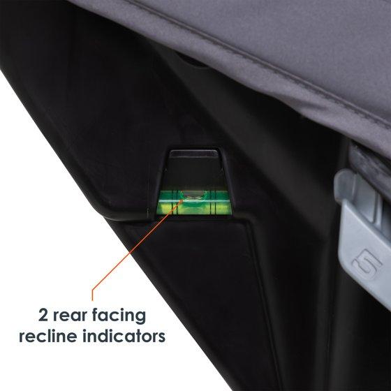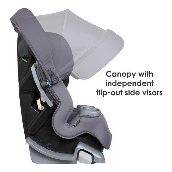 - Integrated Adjustable Canopy for UV Protection: Integrated height and angle adjustable canopy for in-car UV protection. Flip-out side visors provide additional shade protection for either side of the car seat.