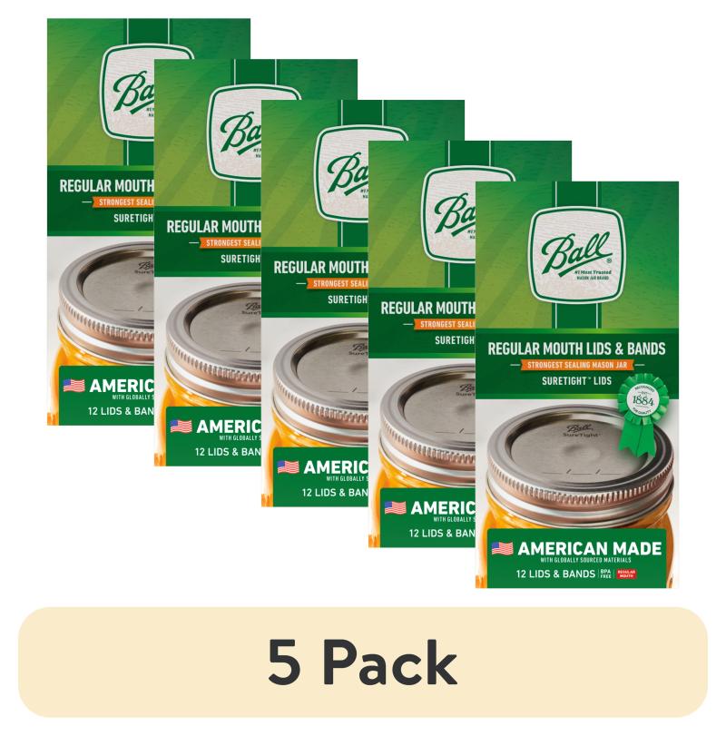 (5 pack) Ball 12-Pack Regular Mouth Canning Jar Lids and Rings, Two-Piece Mason Jar Lids with Bands for Canning and Preserving, Fits Ball Regular Mouth Mason Jars