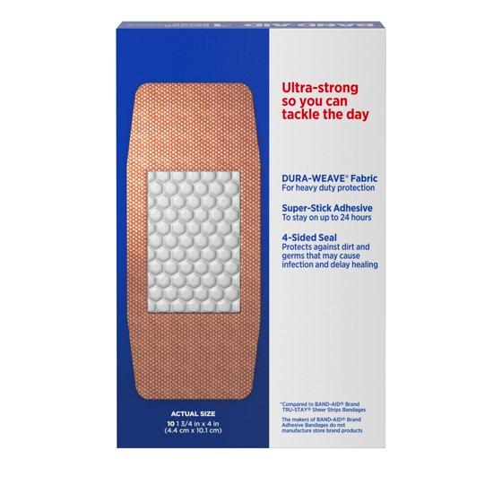 - Box of heavy-duty, extra large BAND-AID Brand Tough Strips Adhesive Bandages for first aid