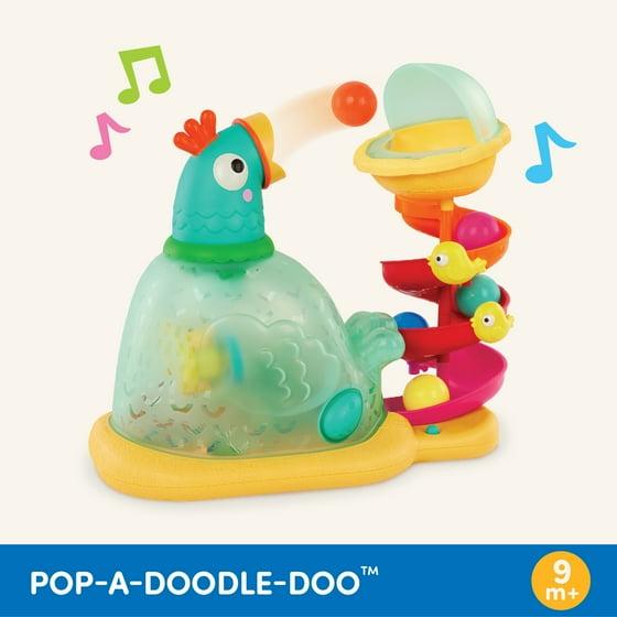 - The Battat Pop-A-Doodle-Doo ball popper is recommended for infants, babies 9 months and over