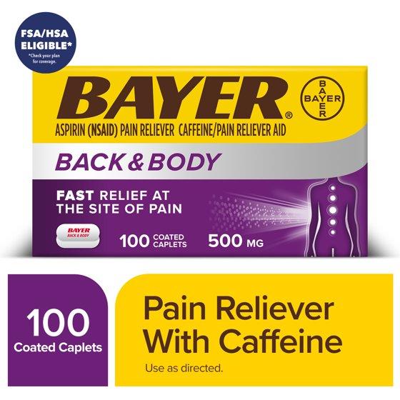 Bayer Back and Body Extra Strength Aspirin 500mg, Aspirin Plus 32.5 mg Caffeine Pain Reliever, Powerful Back and Body Pain Relief, 100 Coated Caplets