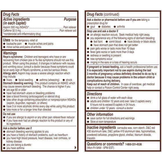 Active Ingredients: *Aspirin (NSAID) (500 mg), Pain Reliever; Caffeine (32.5 mg), Pain Reliever Aid. Inactive Ingredients: Carnauba Wax, Corn Starch, D&C Red 30 Aluminum Lake, D&C Yellow 10 Aluminum Lake, Hypromellose, Powdered Cellulose, Propylene Glycol, Shellac, Titanium Dioxide, Triacetin.