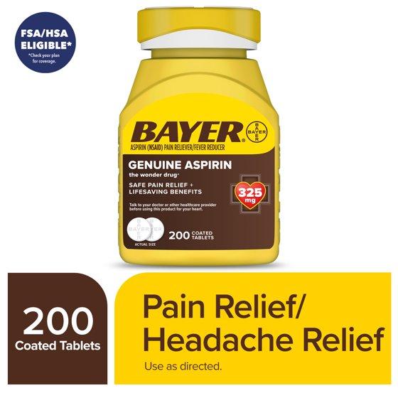 Bayer Aspirin is the original aspirin brand for pain relief. Today, that legacy continues by delivering effective headache relief and multi-symptom support you can count on. Bayer Genuine Aspirin—The Wonder Drug®—is a pain reliever and fever reducer that contains 325mg of aspirin (NSAID)*. This pain medicine for adults and children over 12 provides headache relief and multi-symptom relief of backache, muscle pain, tooth pain, menstrual pain, plus minor arthritis pain relief. Each pain relief tablet is coated for ease of swallowing and is free of caffeine and sodium. When taken for pain, adults and children over 12, take 1 or 2 tablets every 4 hours, or 3 tablets every 6 hours. Drink a full glass of water with each dose, and do not exceed 12 tablets in 24 hours; use as directed. When taken as directed by a doctor, Genuine Bayer Aspirin can help prevent another heart attack or clot-related (ischemic) stroke. Discuss dosing with your doctor. Aspirin is not appropriate for everyone, so be sure to talk to your doctor before you begin an aspirin regimen *Nonsteroidal Anti-Inflammatory Drug