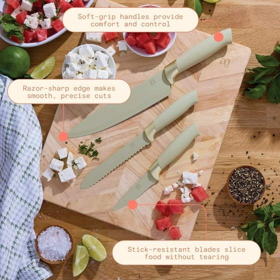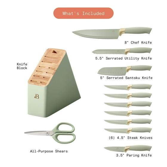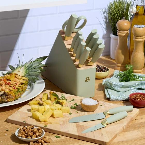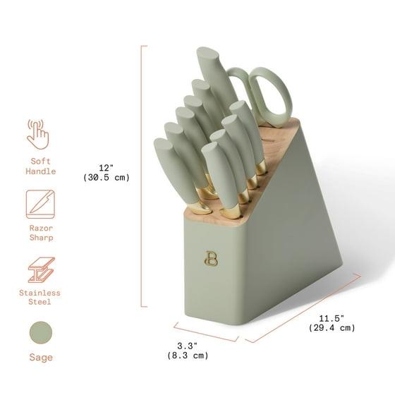 Beautiful 12pc Sage Green Stainless Steel Knife Block Set Soft-Grip Handles by Drew Barrymore