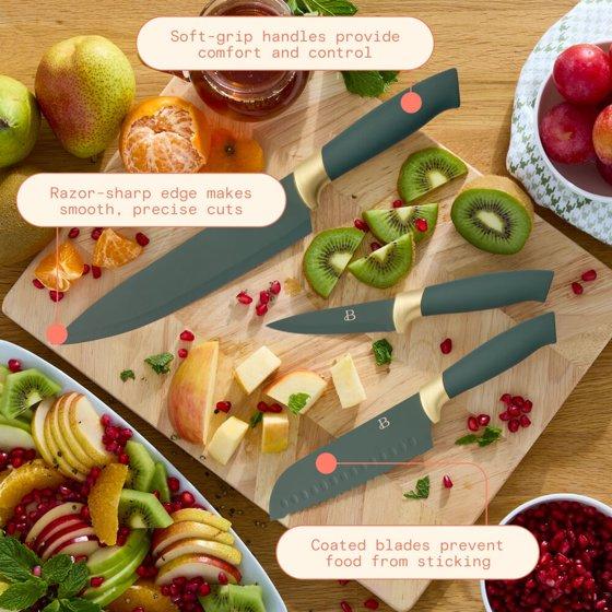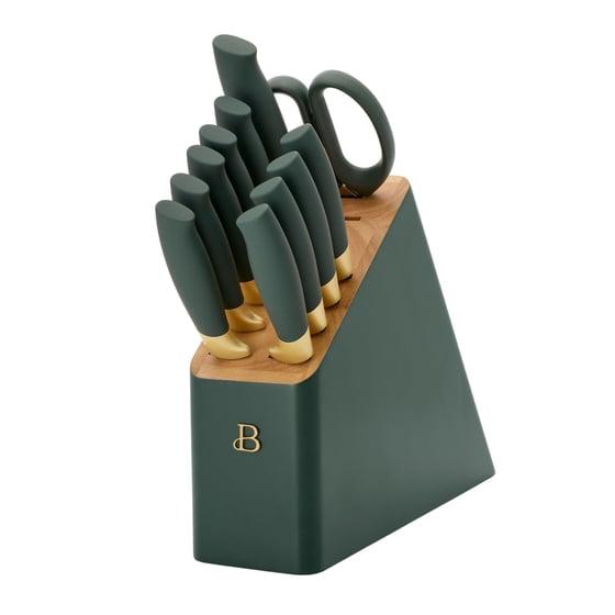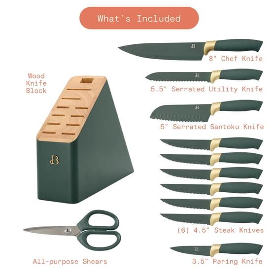 Beautiful 12 Piece Thyme Green and Gold Knife Block Set with Soft-Grip Ergonomic Handles by Drew Barrymore