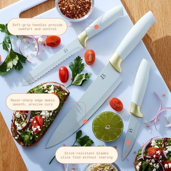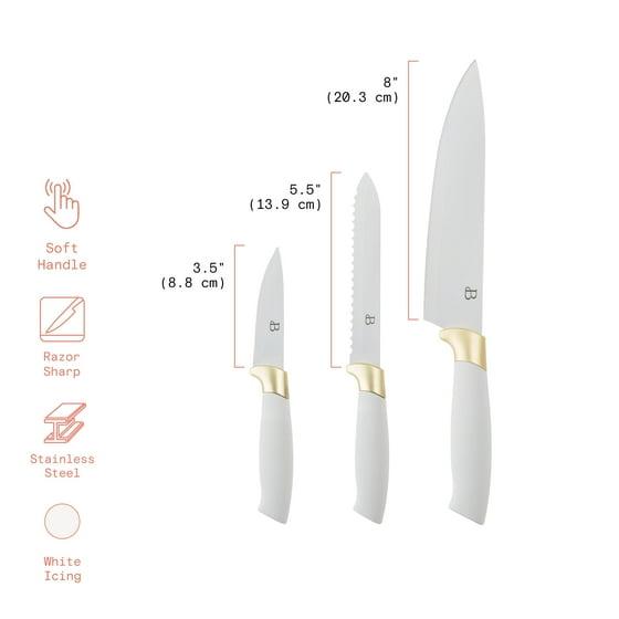 Beautiful 3-Piece Soft Grip Stainless Steel Chef Knife Set White and Gold by Drew Barrymore