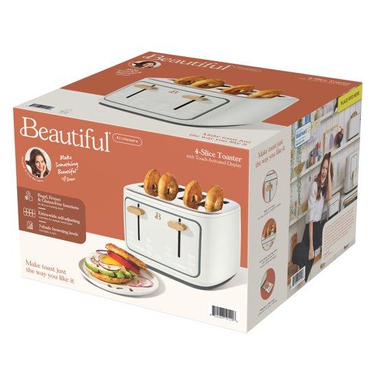 Make mornings easier. The Beautiful 4-Slice Toaster with Touch-Activated Display features 7 settings and a browning control. Convenient presents include Gluten-Free (for higher-density breads), Frozen and Reheat. Its extra wide self-adjusting slots fit a variety of breads and bagels, while an LED countdown ensures that you never burn your bread again. Created by Drew Barrymore, Beautiful Kitchenware® combines elegant design and contemporary colors for high-performance appliances that look beautiful on your kitchen counter. Condition: new.