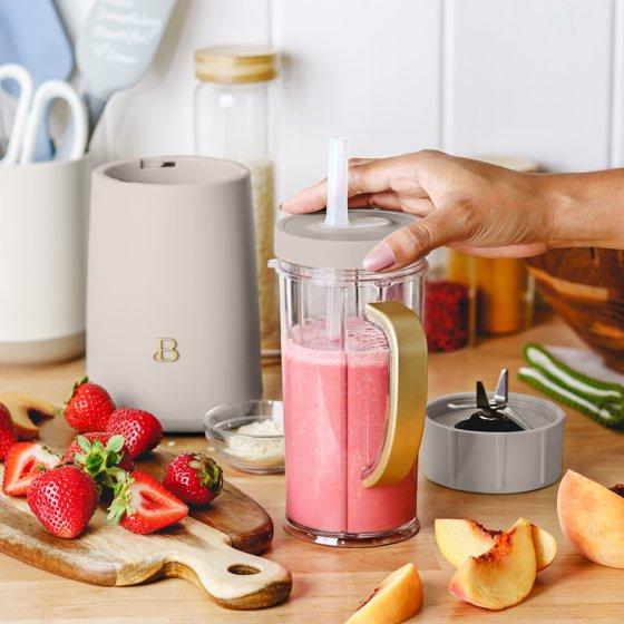 As easy as twist and blend. The Beautiful 12-Piece Personal Blender will be your go-to for smoothies, sauces, salsas and more. Take your smoothies anywhere in the 16 oz To-Go Travel cup with handle and Drew's signature No Drippy Sippy™ flexible straw and twist-off lid. With dishwasher-safe parts for hassle-free cleaning, this personal blender will be your new favorite countertop companion. Created by Drew Barrymore, Beautiful Kitchenware combines elegant design and contemporary colors for high-performance appliances that look beautiful on your kitchen counter.