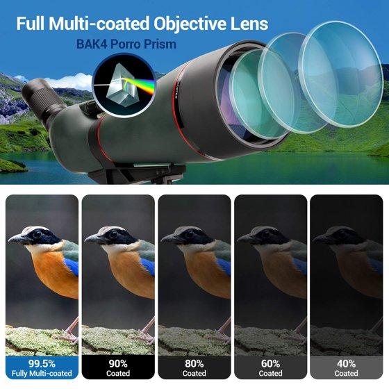 - 【FMC Lens】The spotting scope's objective and eyepiece make by high quality optical lens, which covered with full-multi-coated green film. Effectively increase light transmittance and reduce chromatic aberration, provide brighter, clearer and sharper image and better version experience. The spotting scope can be easily adapted to wetlands, rain forests, or seaside and other humid environments.
